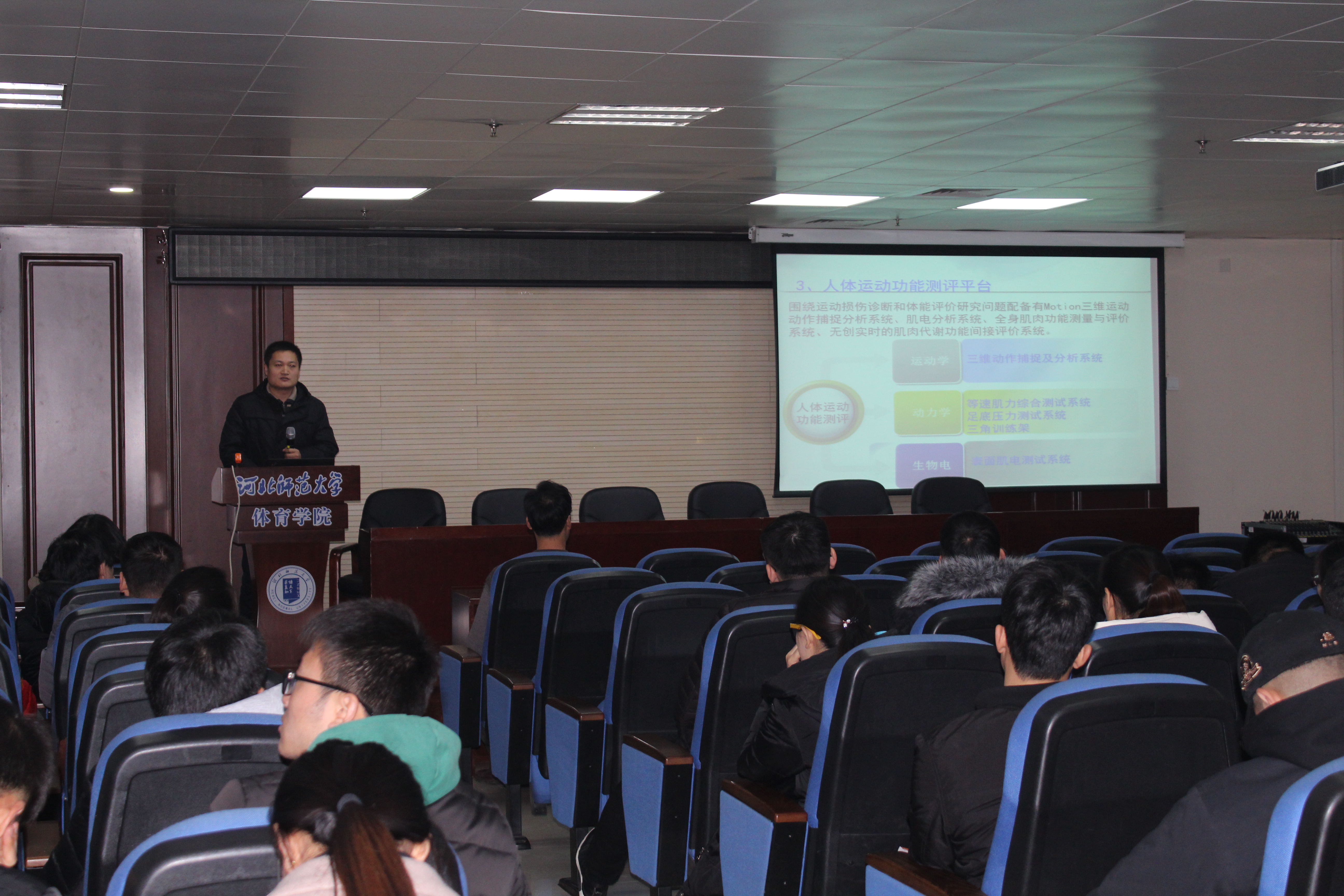 12月21日上午9:00,百家乐在线 在学生讲堂举行了第四期学术沙龙活动暨河北省人体运动生物信息测评重点实验室功能介绍。实验室霍洪峰老师应邀作报告。部分教师和一年级研究生参加了本次学术交流活动。