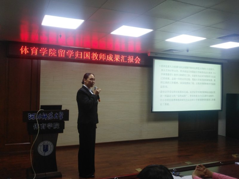 崔冬雪副教授自2017年11月-2018年11月在日本筑波大学进行了一年的访问学习。此次汇报,崔老师分别从“日本小学体育教学现状、筑波大中百家乐在线 师资培养之模拟教学、筑波大学研究生培养之学习会、课题研究、与河北省高俊霞名师工作室的共同研究(U-S体育教育研究共同体)、今后的工作重点”六个方面展开,重点分享了“课堂教学模式、教学信息化支持服务、人才培养模式”等内容,为百家乐在线 专业人才培养提供了可借鉴的思路。崔冬雪博士归国后积极创办“高校-中小学”体育教育研究共同体,邀请中小学体育教学名师走进百家乐在线 为体育教育专业本科生进行“精细化”体育教学研讨,为百家乐在线 开创“高校体育教育专业人才培养立足中小学体育课堂改革需要”的新模式做出积极努力,为致力于服务河北教育而奋斗。